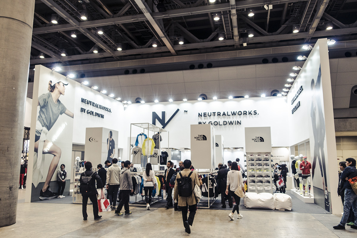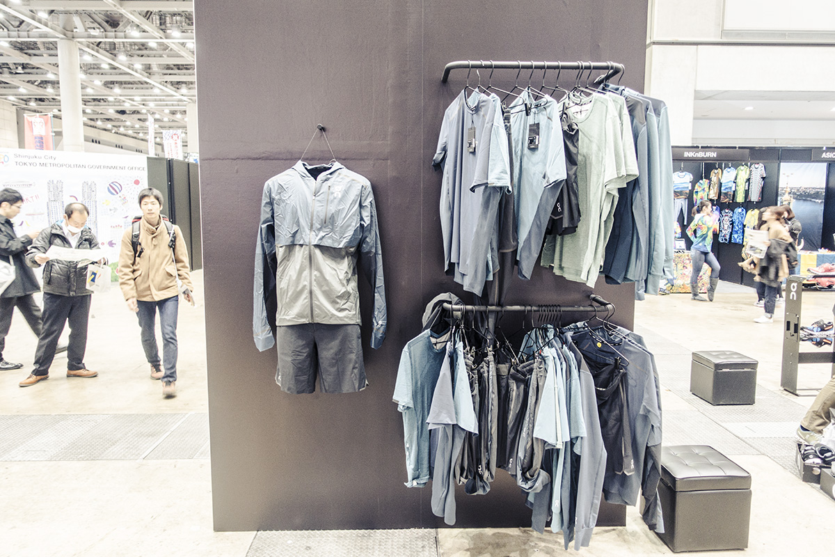 ゴールドウインが出展する『NUTRALWORKS.(ニュートラルワークス)』のブースは、外苑前にある店舗の雰囲気がうまく再現されていました。お洒落なロゴが配されたオリジナルアイテムを中心にTHE NORTHFACE(ザ・ノースフェイス)やC3fit(シースリーフィット)のランニングウェアやシューズがバランス良く置かれ、店舗でお馴染みの『REBOOT STRETCH(リブートストレッチ)』が出張ブースを設けています。