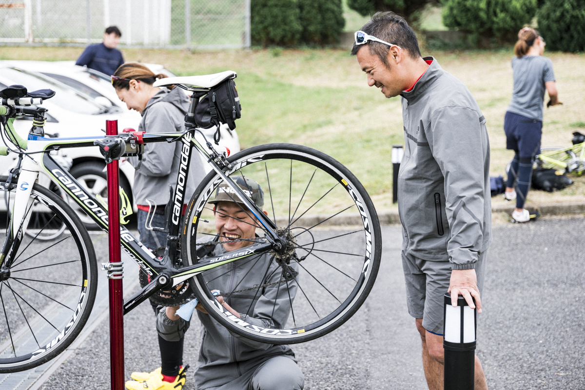 このホテルはトライアスロン合宿のメッカということもあり、『TEAM CPFU』以外にも合宿を張っているチームがちらほら。その雰囲気に触発されて一気にトライアスロンモードに。駐車場には既に自転車を組み立て始めているメンバーが多数。我チームにはトライアスロンショップ『Hi-RIDGE』のKCさんこと高嶺寛己さんも帯同し、メカニックとしてメンバーのマシンを調整してくれていました。