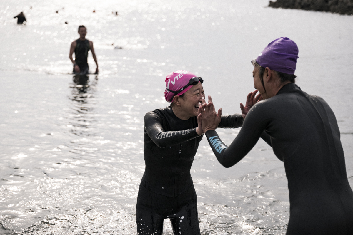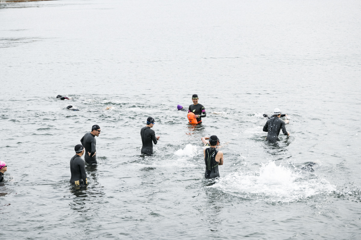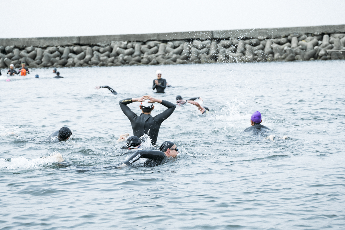 ゴボゴボというバブル音。ゴーグルを通して覗く水の中は薄暗く、フルスーツタイプのウェットスーツを着てはいるものの、丸出しの手と足はジンジンと痺れるように冷たい。そして何より、ブレスの時に口に入る海水の塩辛さ。そうしたものが一気に押し寄せ半ばパニック状態に。これが海で泳ぐということか。オーシャンスイム初体験はなかなかハードなものでした。