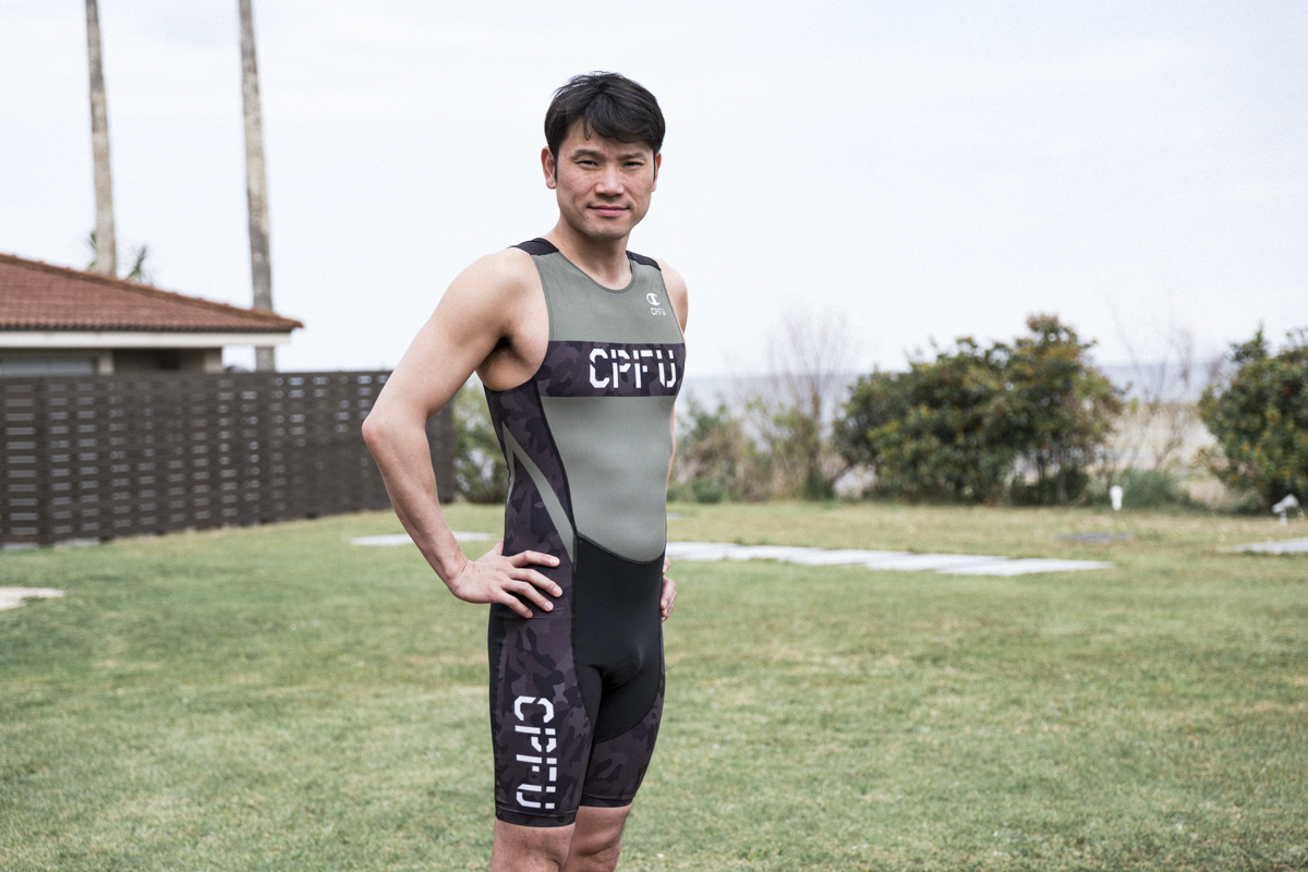 スイム、バイク、ランと3種目を通して本番で着用する大事なウェア。モデルはなんと元世界水泳メダリストの細川大輔さん。TEAM CPFUのメンバーとして参加。